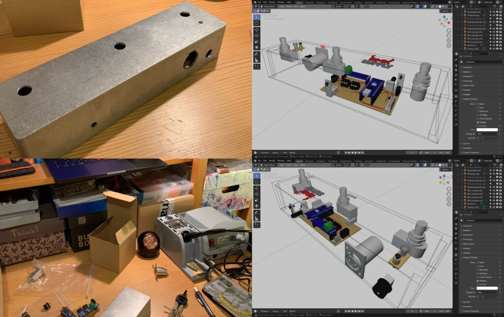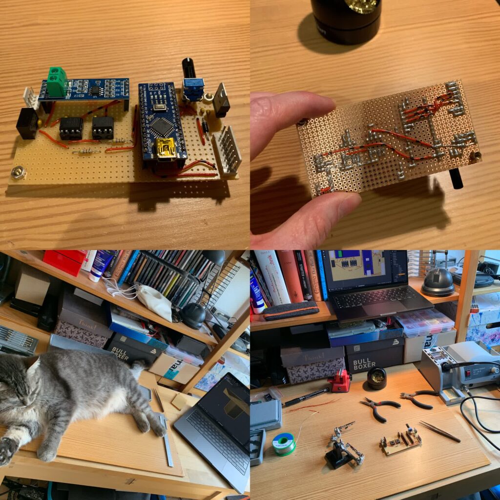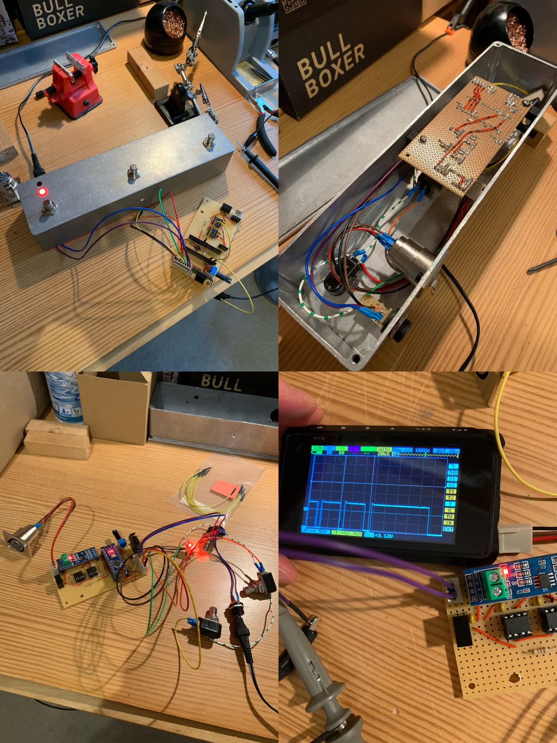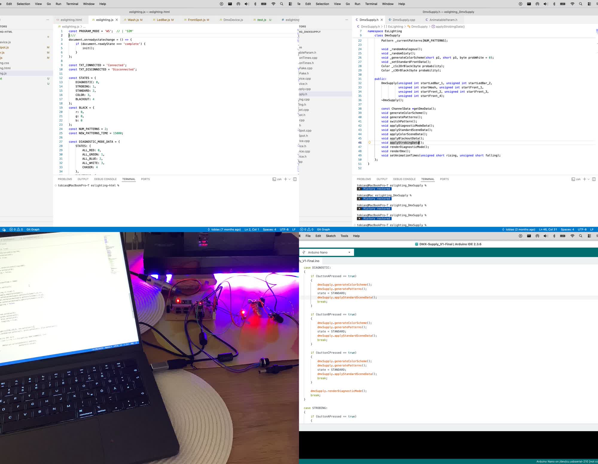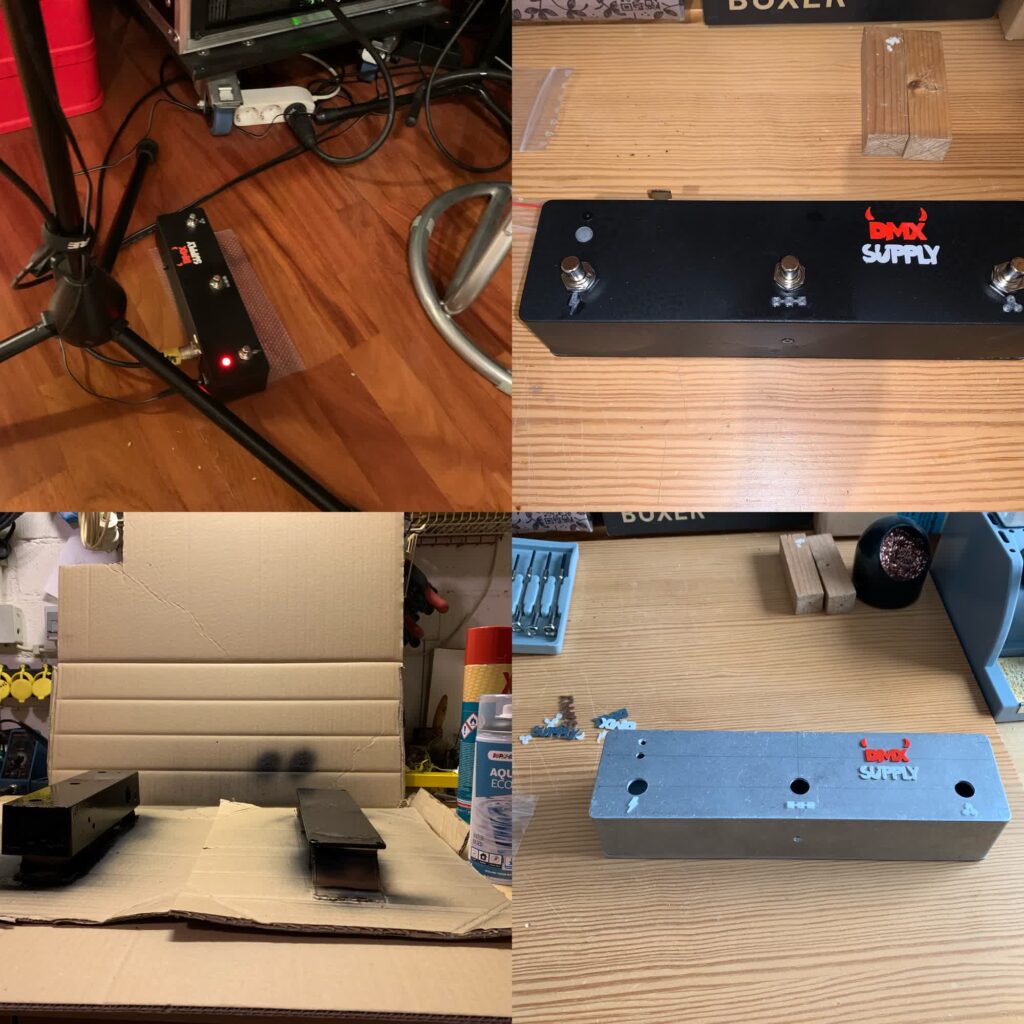 Um unsere Lichtanlage zukünftig per Fuß steuern zu können, ersetzen wir unser Lichtsteuerpult durch einen selbstentwickelten DMX-Controller. Dieser hat einen dynamischen Farbschema- und Patterngenerator, der speziell auf unsere Lichtanlage angepasst ist, und geht damit über die statisch vorprogrammierten Möglichkeiten des alten Lichtpults hinaus. Außerdem kann das Verhalten analoger Leuchtmittel simuliert werden, um in Zeiten von LEDs ein Gefühl von Masse und Energie zu erzeugen. Über drei Fußtaster lässt sich so ein neues Farbschema generieren, zwischen Patterns hin- und herwechseln sowie eine Stroboskop- und die Standardszene aufrufen.